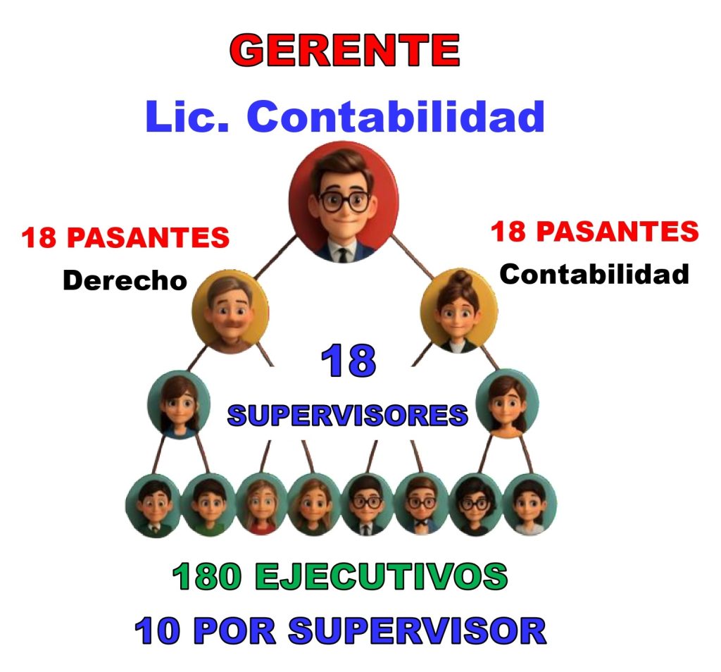 Contaremos con oficinas compartidas por 180 ejecutivos ofertando sus productos y/o servicios en oficinas dirigidas por 18 supervisores y 1 gerente apoyado por 36 asistentes repartidos de la misma forma en cada oficina.